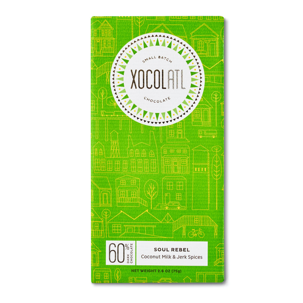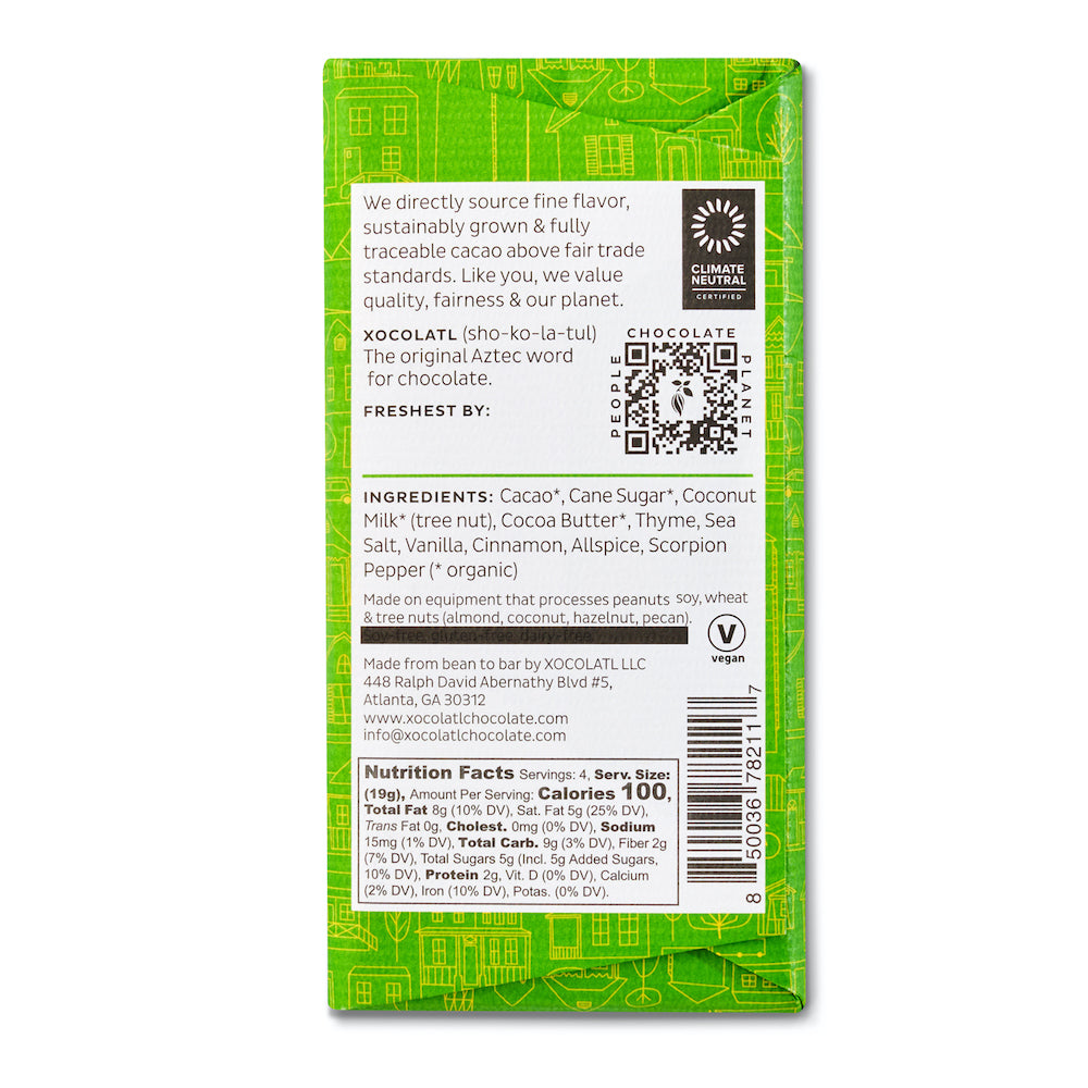 Nicaraguan Cacao, Organic Cane Sugar, Organic Coconut Milk, Jamaican Jerk Spices (thyme, cinnamon, allspice, sea salt, scorpion pepper).