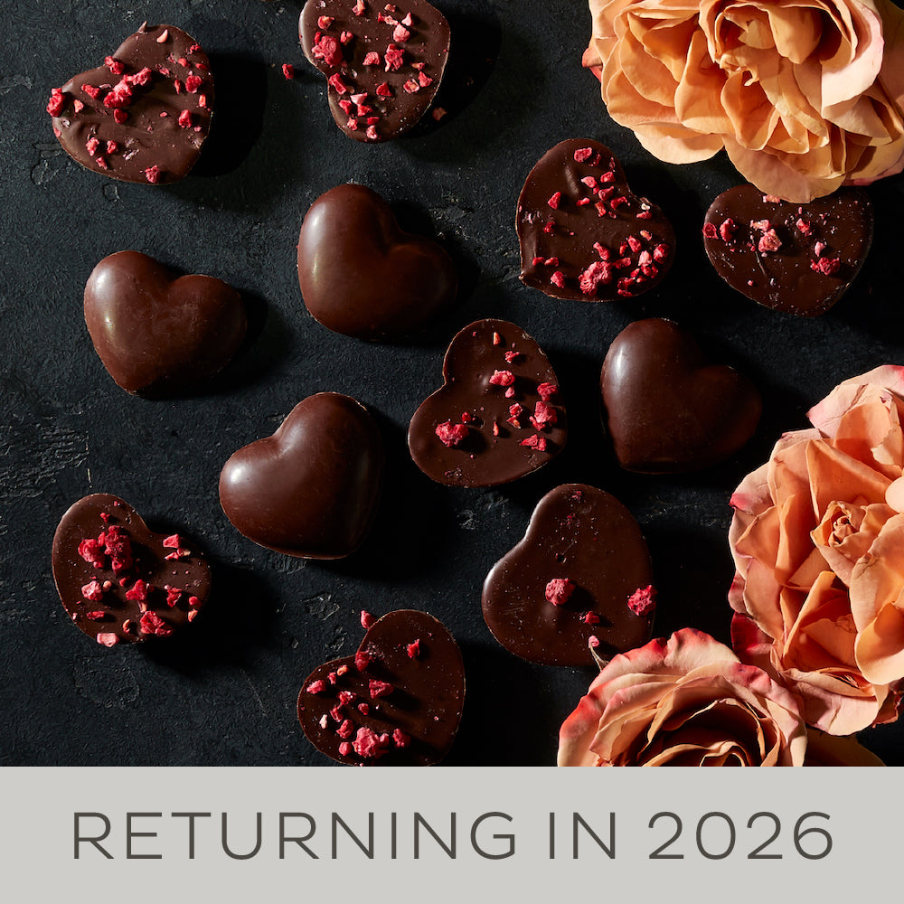 Every year, we get requests for our limited-release dark chocolate hearts weeks before they're ready! We take our award-winning, raspberry and blood orange olive oil dark chocolate and lovingly hand-pour it into heart shaped molds. Topped with a sprinkle of dried strawberries for a pop of color and a rich, fruity flavor, these hearts are perfect for every dark chocolate lover you love. Every glass jar is filled with 3 ounces of dark chocolatey love (approximately 11 individual hearts).