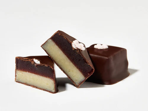 Strawberry white chocolate (cane sugar*, cocoa butter*, almond flour, strawberry, raspberry), lemon pâte de fruits (lemon puree, sugar, pectin, citric acid),coconut milk*, glucose, coconut oil*, salt, dark chocolate (cacao, cane sugar*, cocoa butter*)