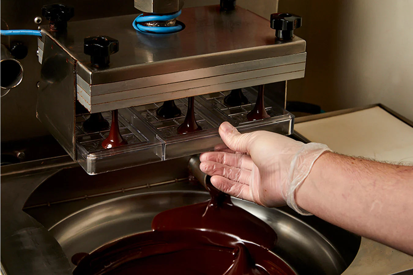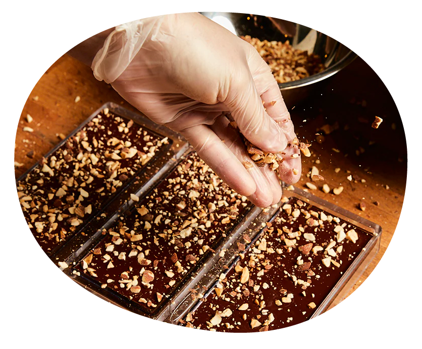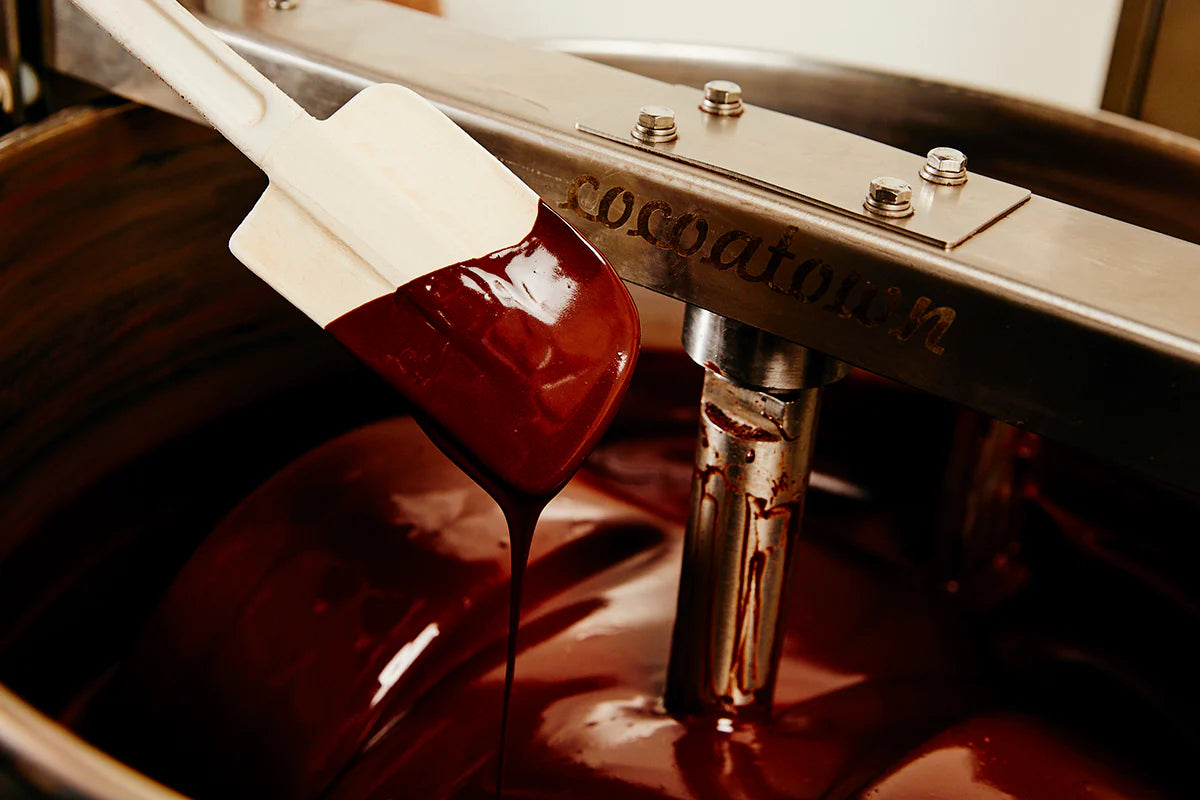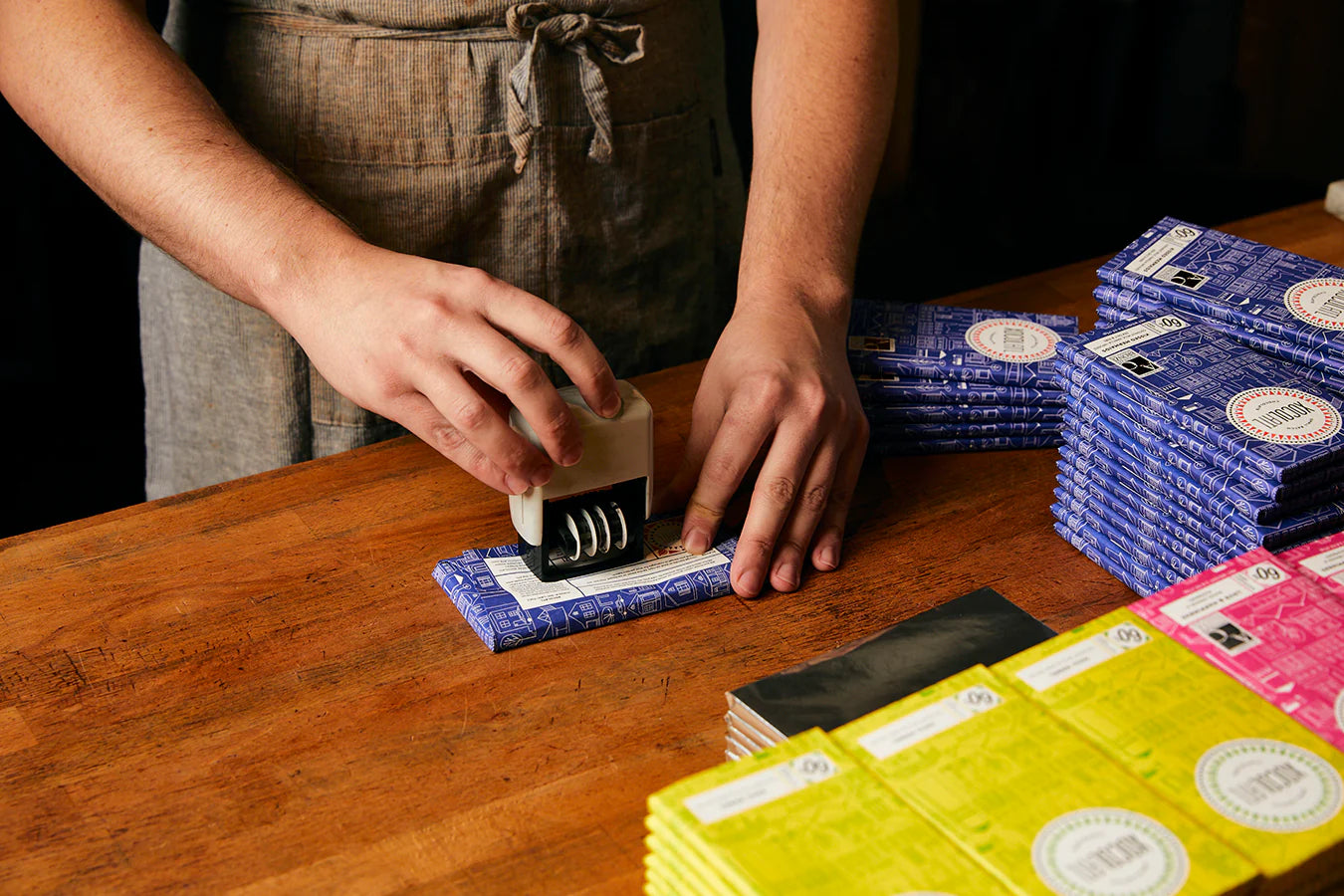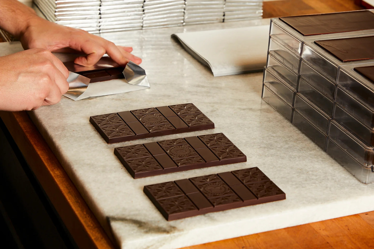 Once the liquid chocolate is perfect, we transfer the chocolate into our tempering machine and mold the chocolate into solid bars. All of our bars are lovingly hand-wrapped in locally designed and locally printed wrappers made of sustainably produced paper with a luxury feel--ready for instant gifting.