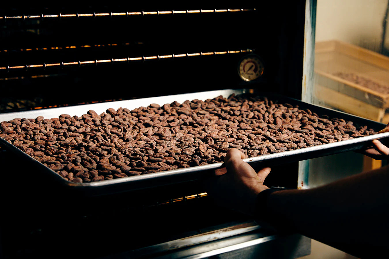 Once we receive the raw cacao, we hand-sort the beans, removing any inferior or broken ones.After dozens of test roasts, we settle on a roasting profile that will best highlight the unique qualities of the cacao from a certain origin. Light roasts highlight fruity and floral qualities while darker roasts bring out nuttier, spicier notes.